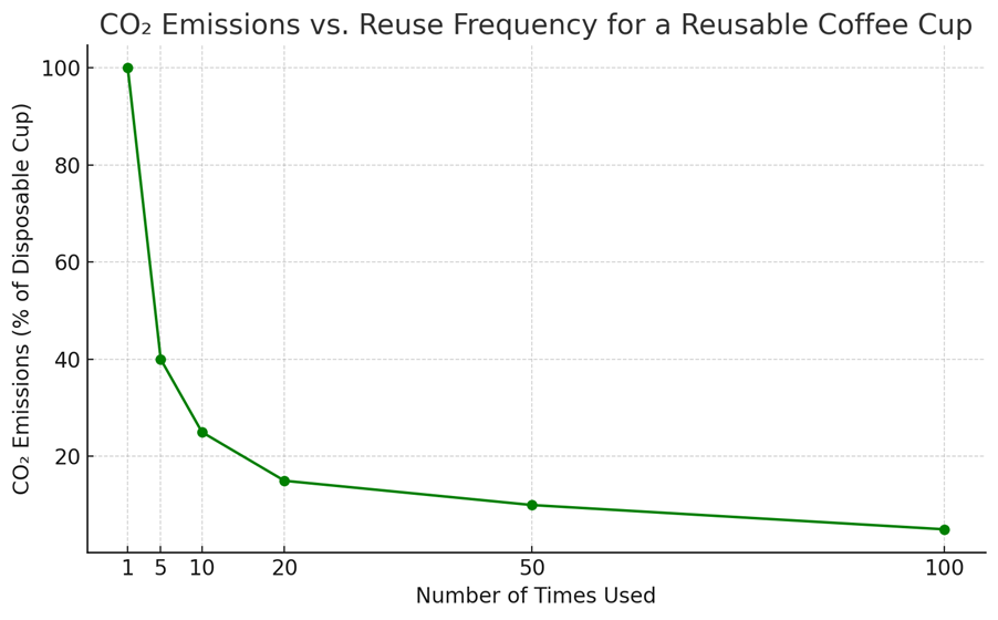Here’s a simple chart showing CO₂ emissions versus reuse frequency for a reusable coffee cup.